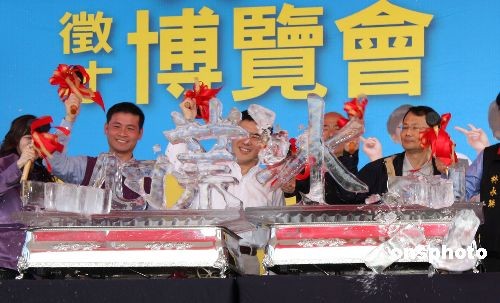 12月20日,在2008臺灣百大服務(wù)業(yè)征才博覽會上,臺北市長郝龍斌率眾嘉賓錘擊“就業(yè)冰河”四字。鼓勵大家齊心抗擊“失業(yè)潮”。中新社發(fā) 陳立宇 攝