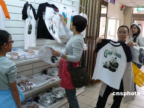大陸贈(zèng)臺(tái)大熊貓“團(tuán)團(tuán)”“圓圓”十二月二十三日晚間抵達(dá)臺(tái)北市立動(dòng)物園。動(dòng)物園內(nèi)紀(jì)念品商店里的大熊貓相關(guān)商品進(jìn)貨數(shù)量激增,民眾購(gòu)買(mǎi)熱情高漲。圖為臺(tái)灣民眾在選購(gòu)印有大熊貓圖案的T恤衫。中新社發(fā) 路梅 攝