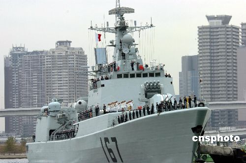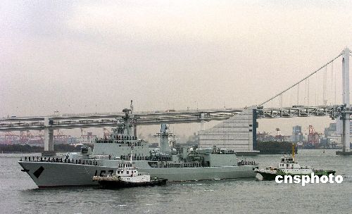 當?shù)貢r間11月28日,中國“深圳”號導彈驅逐艦順利抵達日本東京晴海碼頭,開始對日本為期四天的正式友好訪問。圖為“深圳”號在日本海上自衛(wèi)隊護衛(wèi)艦的護衛(wèi)下駛進晴海碼頭。這是中國人民解放軍海軍軍艦首次訪問日本。