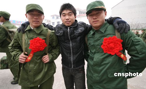 12月11日下午,家住安徽蒙城縣漆園辦事處城北村的雙胞胎兄弟鄭根林、鄭隨林同時(shí)參軍,起程開(kāi)赴各自部隊(duì)開(kāi)始多彩的軍營(yíng)生活。鄭家兄弟自幼羨慕軍營(yíng)生活,今年冬季征兵開(kāi)始后,兄弟倆一起報(bào)名參加體檢和政審,并雙雙通過(guò),被解放軍某部和武警某部批準(zhǔn)入伍,雙胞胎兄弟同時(shí)參軍入伍在當(dāng)?shù)貍鳛榧言挕V行律绨l(fā) 胡衛(wèi)國(guó) 攝