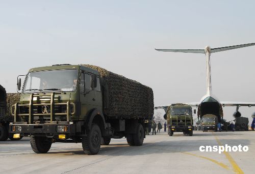 2月1日下午,中國(guó)空軍運(yùn)輸機(jī)再次抵達(dá)山西長(zhǎng)治某軍用機(jī)場(chǎng),緊急空運(yùn)救災(zāi)物資到南方冰雪災(zāi)區(qū)。從1月31日起,中國(guó)空軍運(yùn)輸機(jī)多次飛抵該機(jī)場(chǎng),駐當(dāng)?shù)啬巢肯群蟪鰟?dòng)官兵400多人次,動(dòng)用車輛裝備130多臺(tái)次,日夜奮戰(zhàn),已經(jīng)將100多噸棉被棉衣等救援物資分6個(gè)架次空運(yùn)南方,以解南方災(zāi)區(qū)人民御寒之急。中新社發(fā) 姚林 攝