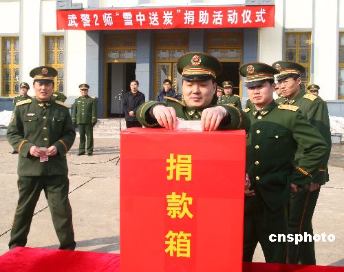 2月3日,駐江蘇宜興武警部隊(duì)舉行“雪中送炭”捐款活動,官兵們向宜興慈善會捐款73540.5元,這些善款不久將轉(zhuǎn)送到災(zāi)民手中。中新社發(fā) 丁煥新 攝