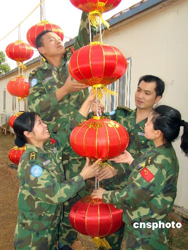 中國第三批赴蘇丹瓦烏維和部隊(duì)為使官兵在環(huán)境艱苦、條件惡劣的任務(wù)區(qū)度過一個(gè)祥和、愉快的春節(jié),堅(jiān)持以人為本,積極克服聯(lián)合國后勤供應(yīng)不及時(shí)的困難,立足現(xiàn)有條件、因地制宜,科學(xué)安排,勤儉節(jié)約,較好地保證了在春節(jié)期間,官兵飲食有保障,過年有氛圍。中新社發(fā) 劉恩海 攝