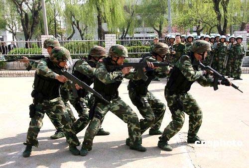 為確保奧運安全和奧運火炬?zhèn)鬟f期間社會治安穩(wěn)定,更加有效地防范和處置恐怖和突發(fā)事件,近日奧運火炬?zhèn)鬟f途徑地-山東省日照市公安局組織武警支隊舉行了反恐、處置恐怖和突發(fā)事件演練。圖為武警官兵進行反恐基本隊形演練。中新社發(fā) 黨正林 攝