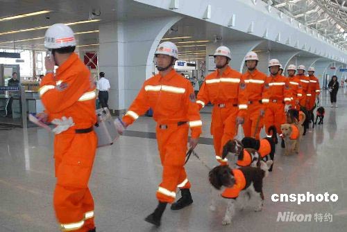 5月13日,沈陽市消防支隊30名特勤官兵帶著10條消防搜救犬,乘專機火速奔赴四川地震災(zāi)區(qū),全力參加抗震救災(zāi)。 圖為出發(fā)前的特勤官兵和搜救犬。中新社發(fā) 王忠喜 攝