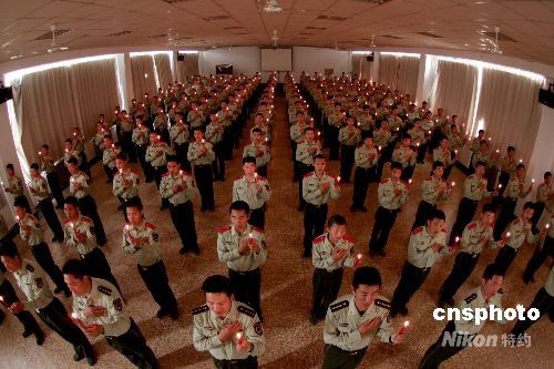 5月14日,武警河北總隊(duì)石家莊市支隊(duì)機(jī)動(dòng)大隊(duì)的官兵們,點(diǎn)燃手中的蠟燭,唱響“祝你平安”、“讓世界充滿愛(ài)”等歌曲,為在四川汶川等地地震災(zāi)害中受災(zāi)的同胞祈福。中新社發(fā) 余洪恩 攝