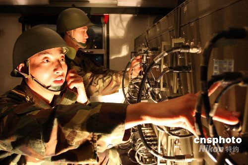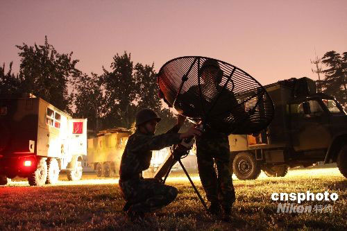 2008年9月2日,山東青島,負責(zé)殘奧會安保任務(wù)的戰(zhàn)士們在進行實戰(zhàn)條件下通信保障演練。中新社發(fā) 梁志杰 攝