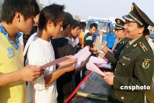 10月15日,江蘇省鎮(zhèn)江市潤州區(qū)人武部干部在向第三職教中心的學(xué)生宣傳征兵新政策。當(dāng)日,江蘇省鎮(zhèn)江市潤州區(qū)人武部干部分別走進(jìn)轄區(qū)內(nèi)的鎮(zhèn)江市第三職教中心和江蘇科技大學(xué),結(jié)合今年冬季征兵新政策,重點面向大學(xué)和高中的應(yīng)屆畢業(yè)生開展征兵宣傳,鼓勵廣大學(xué)子積極應(yīng)征入伍,為祖國的國防建設(shè)出力。中新社發(fā) 石玉成 攝