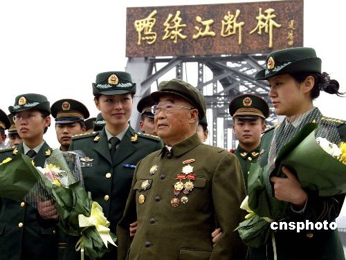 10月22日,85歲高齡的志愿軍老戰(zhàn)士黎民和駐守祖國東大門的丹東邊防檢查站官兵一起,為橋頭的彭德懷將軍和志愿軍雕塑群像獻(xiàn)花。10月25日是中國人民志愿軍抗美援朝赴朝作戰(zhàn)58周年紀(jì)念日。據(jù)悉,黎民老人在抗美援朝時期作為部隊(duì)的宣傳干事,拍攝了志愿軍渡江赴朝作戰(zhàn)的標(biāo)志性作品——《跨過鴨綠江》。這張照片后來成為中國人民志愿軍抗美援朝赴朝作戰(zhàn)時徒步跨過鴨綠江中唯一一張歷史存照。中新社發(fā) 陳浩浩 攝