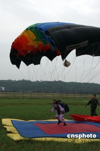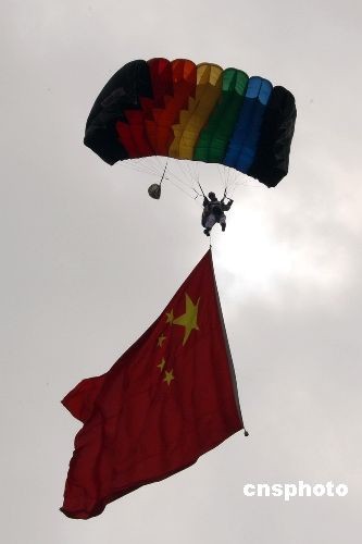 11月初,第七屆中國國際航空航天博覽會(huì)上,中國空軍跳傘運(yùn)動(dòng)大隊(duì)的27名隊(duì)員先后進(jìn)行了跳傘表演,其中的喜從天降、航空盛典、東方之珠、金龍飛舞、空中彩虹等精彩課目。圖為空軍跳傘運(yùn)動(dòng)大隊(duì)隊(duì)員肖茜蓉帶著鮮艷的五星紅旗第一個(gè)從天而降。中新社發(fā) 譚超 攝