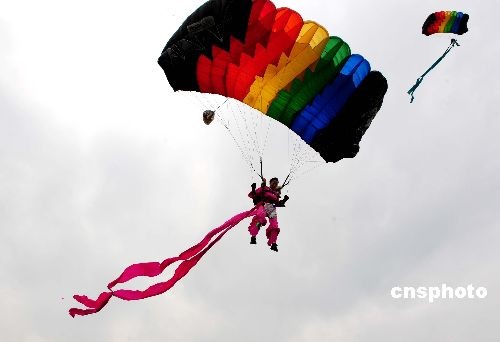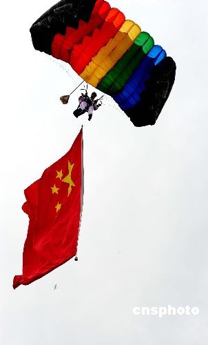 11月4日,100條彩帶從天而降,四名跳傘隊(duì)員分別護(hù)衛(wèi)著國(guó)旗、八一軍旗、空軍軍旗和會(huì)旗徐徐飄落,成為中國(guó)航展開幕式上一道靚麗的風(fēng)景線。 擔(dān)負(fù)跳傘表演任務(wù)的是空軍八一跳傘隊(duì)的27名男女運(yùn)動(dòng)員,他們表演了“喜降彩帶”、“航空盛典”、“東方之珠”、“金龍飛舞”、“空中彩虹”和“仙女下凡”六個(gè)項(xiàng)目。中新社發(fā) 沈玲 攝