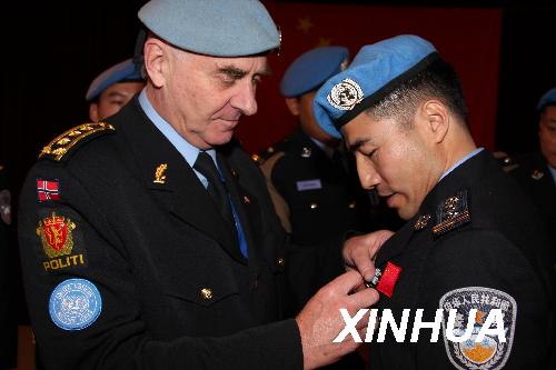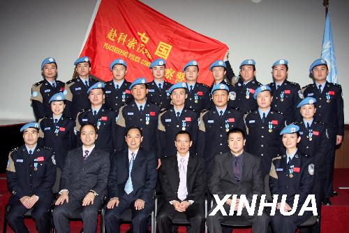11月16日,中國第五批駐科索沃維和警察榮獲聯(lián)合國維和勛章的授勛儀式在科首府普里什蒂納舉行。第五批中國維和警察于2008年3月11日抵達(dá)普里什蒂納,執(zhí)行聯(lián)合國為期一年的維和任務(wù)。這支警隊是四川省公安廳受中國公安部委托單獨組建的。新華社記者連國輝攝