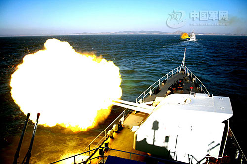 圖:北海艦隊艦載100毫米雙管艦炮開火