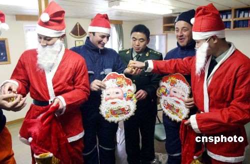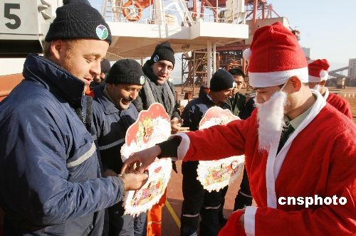 12月23日,江蘇公安邊防總隊(duì)連云港邊防檢查站的戰(zhàn)士扮成“圣誕老人”來(lái)到停泊在連云港口岸的外輪上,為外籍船員送去祝福和圣誕禮物,讓外籍船員在中國(guó)感受圣誕快樂(lè)。中新社發(fā) 王健民 攝