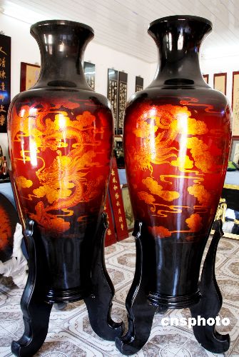 圖為10月23日拍攝到的江西鄱陽一對高180厘米脫胎漆器金龍瓶。該瓶以生漆為原料,經(jīng)制模、裹布和脫胎、拋光等50多道純手工工序,由該縣一民營企業(yè)歷經(jīng)2年半時間制作完成,是目前國內(nèi)最高的一對脫胎漆器金龍瓶。據(jù)悉,被譽為“中華三寶”之一的脫胎漆器,始于東漢。鄱陽脫胎漆器歷史悠久,現(xiàn)已被列入江西省非物質(zhì)文化遺產(chǎn)名錄。中新社發(fā) 卓忠偉 攝
