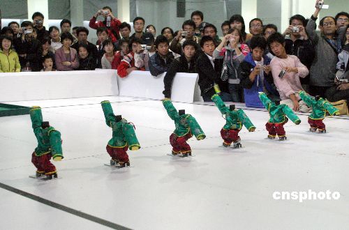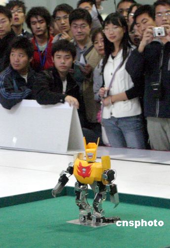 10月26日,為期3天的2007“銀泉杯”中國(guó)機(jī)器人大賽暨Robo Cup中國(guó)公開賽在濟(jì)南大學(xué)科技園開幕。據(jù)了解,本次大賽共有來(lái)自國(guó)內(nèi)外的400多支隊(duì)伍1000余名選手參賽,大賽設(shè)置了34個(gè)比賽項(xiàng)目,包括Robo Cup機(jī)器人比賽、FIRA機(jī)器人比賽、空中機(jī)器人比賽、水中機(jī)器人比賽、舞蹈機(jī)器人比賽及雙足競(jìng)步機(jī)器人比賽等多種比賽類型,是歷屆中國(guó)機(jī)器人大賽中比賽種類最多和最全的一次。中新社發(fā) 龔輝 攝