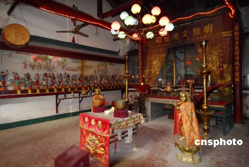 日前,經(jīng)有關(guān)專家學(xué)者考證,福州市臺江區(qū)寧化街道浦西路上的“福壽宮”曾是“明教文佛祖殿”,廟里保存著一尊清代脫胎工藝制造的明教文佛像,以及清代繪制的明教文佛祖殿全景圖掛軸,福州市文物局原局長曾意丹表示,所有這些實物都已證明這座廟宇是福建省乃至全國罕見的又一明教(摩尼教)重要遺址。圖為“福壽宮”正殿中間寫有“明教文佛祖殿”字樣。中新社發(fā) 王東明 攝