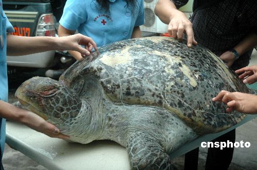 2007年11月1日,海南省小動(dòng)物保護(hù)協(xié)會在?谑袞|海岸海邊救助一只約1米多長、重150公斤左右的國家二級野生保護(hù)動(dòng)物綠海龜,移交給海洋漁業(yè)部門處理。該只罕見的綠海龜由附近居民發(fā)現(xiàn)后并自發(fā)呵護(hù),但救助時(shí)已經(jīng)死亡。海南省漁業(yè)監(jiān)察總隊(duì)有關(guān)負(fù)責(zé)人稱,初步估計(jì)它至少有100歲以上,身上有多處傷痕,需要解剖才能查明真正死因,有關(guān)方面將把它制作成標(biāo)本展覽,以教育人們保護(hù)海龜。中新社發(fā) 善平 攝
