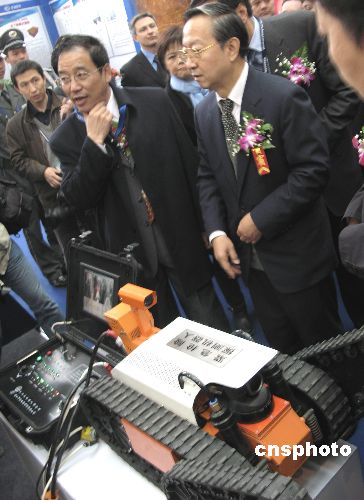 11月6日上午,“第十二屆中國國際煤炭采礦技術(shù)交流及設(shè)備展覽會”在北京全國農(nóng)業(yè)展覽館開幕。開幕式上,中國國家安全監(jiān)督管理總局局長李毅中來到1號展廳,在中國研制的首臺“緊急搶險(xiǎn)探測機(jī)器人”前,詢問有關(guān)技術(shù)指標(biāo)。這臺由哈工大機(jī)器人研究所與唐山開誠公司共同研制的有線遙控機(jī)器人,可以在遇難、遇險(xiǎn)礦井中行走500米距離,并可以爬坡、越障,到達(dá)指定地點(diǎn),并探測井下有毒氣體、溫度、風(fēng)速數(shù)據(jù),對遇險(xiǎn)礦工地段進(jìn)行探測救險(xiǎn)。中新社發(fā) 鄒憲 攝