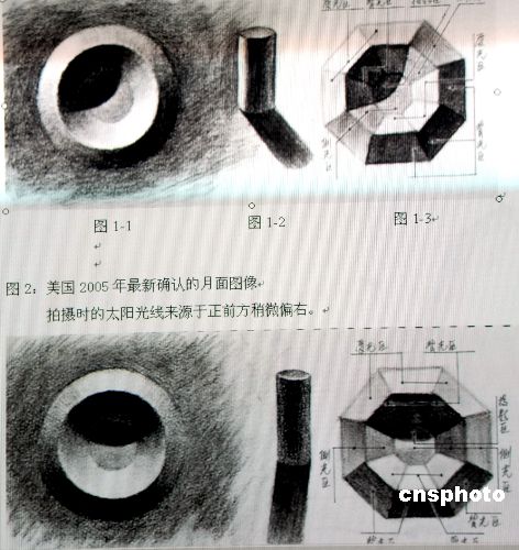 2007年12月6日,海南在京的一位畫家從光學(xué)角度找到中美兩“月亮”鮮明差別。中國嫦娥首幅月球圖像抄襲美國的傳言,在網(wǎng)上一度鬧得沸沸揚揚,海南省畫家、超常創(chuàng)意專家于廣勝在北京,反復(fù)對照中美兩圖琢磨研究,從光學(xué)角度發(fā)現(xiàn)兩幅圖象有著“更加鮮明的差別”,6日早晨他發(fā)現(xiàn)兩幅圖像是在不同的光源下拍攝的,從另一側(cè)面有力證明了我國嫦娥傳回圖像的真實性。于廣勝說,這一證據(jù)是普通大眾不易發(fā)現(xiàn)的,但通過他所手繪的幾幅圖,即可讓普通大眾一目了然。同時,凡是對光學(xué)有所研究或通曉繪畫用光、攝影和攝像用光的人們,自然明白其理。為了便于廣大讀者理解,他把地球上的環(huán)形山簡化為內(nèi)凹外凸的圓臺(圖1-1、2-1),以顯現(xiàn)不同光線來源下的不同光影效果;由此,又進(jìn)一步簡化為內(nèi)凹外凸八棱臺(圖1-3、2-3)并標(biāo)注了光線的來源和受光、測光、背光區(qū)域;同時,又畫了一個圓柱體(1-2、2-2)以顯現(xiàn)不同光照角度下的不同投影方向。通過兩組手繪圖,中國與美國公布的兩張圖像在拍攝時,太陽光照射月球角度明顯不同,至少左右相差42度左右。中國拍攝時的太陽光線來源于左前方,而美國拍攝時的太陽光線來源于正前方稍微偏右。于廣勝說,稍有電腦平面制作、攝影和攝像后期制作知識的人們都明白,圖片與圖片的任意組合拼接是輕而易舉的,但要想把圖片中各個圖像所有細(xì)節(jié)的光影全部改變是不可能的,“由此可見,我國嫦娥傳回的圖像其真實性是不容質(zhì)疑了!毕嚓P(guān)鏈接:12月2日,中國探月工程首席科學(xué)家、中國科學(xué)院院士歐陽自遠(yuǎn)做客上!拔膮R講堂”,對關(guān)于“嫦娥首幅月球圖像抄襲美國”的傳言作出澄清:“嫦娥傳回的圖像確實是真實的,是經(jīng)過非常復(fù)雜的拍攝、傳輸、接收、處理過程后得到的,并且與美國所拍的圖像有細(xì)微差別”。我國嫦娥一號衛(wèi)星所攝的月面圖像上,某個地方有兩個小坑,而美國2005年最新確認(rèn)的月面圖像上,同樣的地方只有一個小坑。中新社發(fā) 善平 攝
