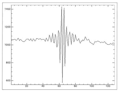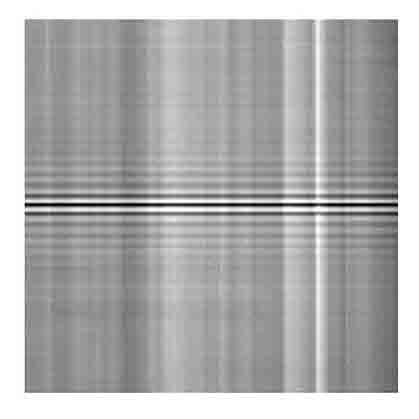 圖1、干涉圖(橫軸為空間像元,縱軸為干涉曲線采樣點(diǎn)數(shù),本圖是右圖從上向下第一行對應(yīng)干涉圖)