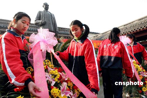 浙江紹興的中學生們向周恩來塑像獻花籃。