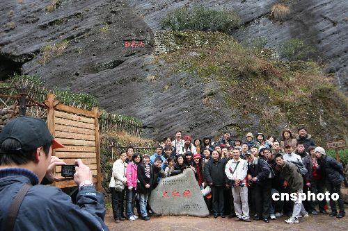 一月二十七日上午,兩岸三校師生在福建武夷山景區(qū)的大紅袍古老茶樹下合影留念。二十三日至二十七日,臺灣嘉義大學(xué)、臺灣屏東科技大學(xué)與福建農(nóng)林大學(xué)的四十位師生在此間開展茶文化之旅,探尋當(dāng)?shù)氐牟栉幕。中新社發(fā) 周文杰 攝