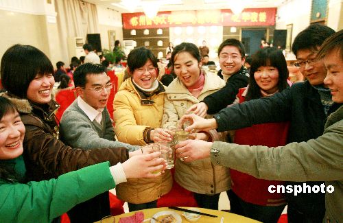 2月2日晚,江蘇蘇州高校百余名留守大學(xué)生齊聚東吳飯店,參加寒假“心愿六選一”(即,一張親情電話卡、一頓年夜飯、一次勤工儉學(xué)、一次英語培訓(xùn)、一次心理咨詢和一場免費(fèi)電影)之年夜飯大聯(lián)歡活動。 中新社發(fā) 蘇秀 攝