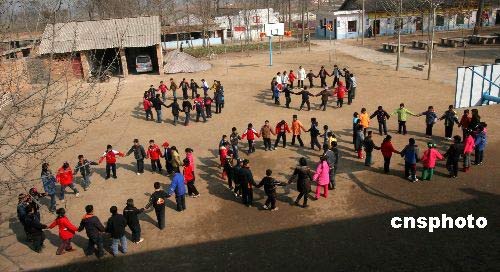 2月22日,啟航學(xué)校的留守學(xué)生手拉手組成奧運(yùn)“五環(huán)”標(biāo)志圖案。當(dāng)日,陜西興平市趙村鎮(zhèn)啟航學(xué)校2008年春季開學(xué),該校240多名留守學(xué)生入學(xué)報(bào)到,老師領(lǐng)著學(xué)生們在操場上手拉手組成了奧運(yùn)“五環(huán)”標(biāo)志圖案,表達(dá)留守孩子們對2008年北京奧運(yùn)會(huì)的期盼和祝福。中新社發(fā) 何建虎 攝