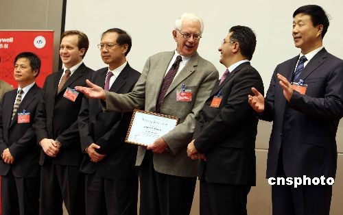 四月九日,全球500強、世界領(lǐng)先的多元化高科技制造企業(yè)霍尼韋爾公司攜手北京航空航天大學,共同拉開2008年霍尼韋爾—諾貝爾全球校園行的序幕。諾貝爾物理獎獲得者謝爾登·格拉肖博士(右三)親臨現(xiàn)場為學子們講授了他的學術(shù)成果和科研心得,與學生們進行了面對面的交流;裟犴f爾—諾貝爾全球校園行活動由霍尼韋爾公司發(fā)起,旨在全球范圍內(nèi)提升高?茖W教育、培養(yǎng)高素質(zhì)科技創(chuàng)新人才的社會公益活動。中新社發(fā) 任海霞 攝