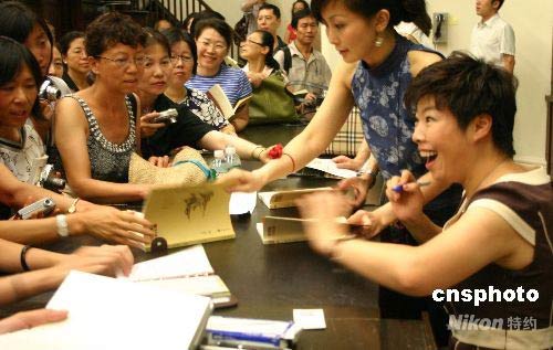 北京師范大學教授于丹20日在美國紐約哥倫比亞大學舉行講座,吸引數(shù)百“于丹迷”到場。圖為于丹講座結束后為“于丹迷”們簽名留念。中新社發(fā) 李靜 攝