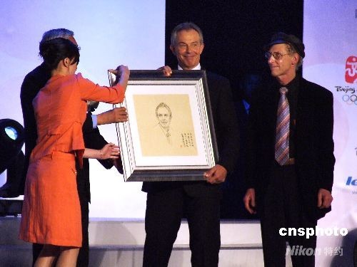 8月4日,由北京大學(xué)主辦的“2008奧運(yùn).冠軍論壇”在北京大學(xué)百年紀(jì)念講堂內(nèi)隆重開幕。出席開幕盛典的貴賓有英國前首相托尼.布萊爾、成龍、譚盾、揚(yáng)揚(yáng)、羅雪娟在內(nèi)的數(shù)十位中外嘉賓。圖為北京大學(xué)校長許智宏向英國前首相托尼.布萊爾贈送畫像。中新社發(fā) 鄭雄增 攝