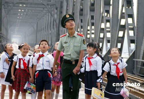 9月9日,開(kāi)學(xué)伊始,又逢教師節(jié),遼寧丹東邊防檢查站邀請(qǐng)駐地多所小學(xué)師生參觀中朝友誼橋,與邊防戰(zhàn)士一同描繪第二故鄉(xiāng)美景。中新社發(fā) 陳浩浩 攝