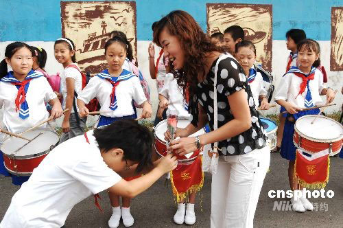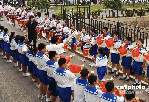 9月10日早上,在遼寧省大連市甘井子區(qū)金二小學(xué)學(xué)校門前,鼓樂喧天,學(xué)生們將鮮花獻(xiàn)給每位老師,表達(dá)對老師的節(jié)日祝福。當(dāng)日是我國第24個教師節(jié),各地院校師生開展多種形式的活動,慶賀教師節(jié)。中新社發(fā) 劉德斌 攝