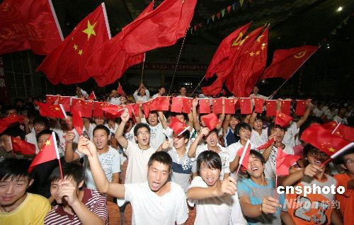 9月25日21時(shí)33分,北京航天飛控中心宣布“神七”發(fā)射成功。重慶科創(chuàng)職業(yè)學(xué)院大禮堂里觀看電視直播的2000多名學(xué)生頓時(shí)揮舞著手中的國旗歡呼雀躍。21時(shí)10分,搭乘著翟志剛、劉伯明、景海鵬3位航天員的神舟七號(hào)飛船在中國酒泉衛(wèi)星發(fā)射中心發(fā)射升空,這是神舟飛船第七次飛入太空,也是中國人第三次登上太空。中新社發(fā) 陳仕川 攝