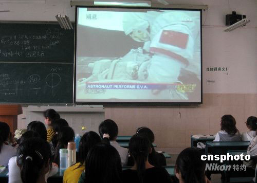 2008年9月27日下午,安徽師范大學(xué)學(xué)生在教室集體觀看宇航員太空行走直播。北京時間9月27日下午四點五十九分,神舟七號航天員翟志剛成功出艙,實現(xiàn)中國歷史上第一次太空行走。中新社發(fā) 劉淮宇 攝