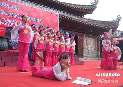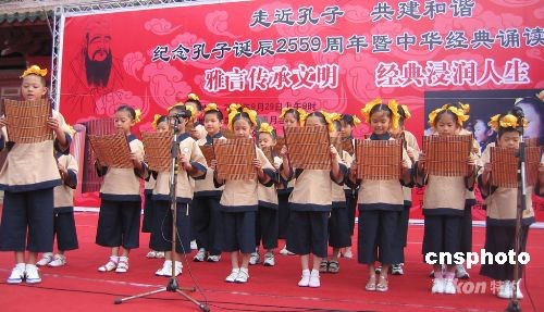 九月二十九日上午,為紀(jì)念孔子誕辰二千五百五十九周年,一場(chǎng)大型的中華經(jīng)典誦讀活動(dòng)在福建泉州府文廟廣場(chǎng)舉行,旨在弘揚(yáng)和傳承中華優(yōu)秀民族文化,倡導(dǎo)尊師重教風(fēng)尚。中新社發(fā) 黃瑤瑛 攝