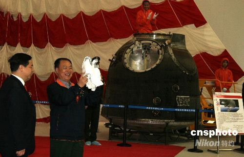 10月1日上午,神舟七號(hào)載人飛船返回艙在其誕生地——中國(guó)航天科技集團(tuán)公司所屬中國(guó)空間技術(shù)研究院舉行開艙暨搭載物交接儀式,伴隨三位中國(guó)航天員太空飛行六十八小時(shí)二十七分鐘的一批特殊“乘客”一一精彩亮相,隨后各歸其主。圖為中國(guó)載人航天工程航天員系統(tǒng)總指揮兼總設(shè)計(jì)師、中國(guó)航天員科研訓(xùn)練中心主任陳善廣展示將由該中心珍藏、首次成功使用過的“飛天”艙外航天服手套。中新社發(fā) 孫自法 攝
