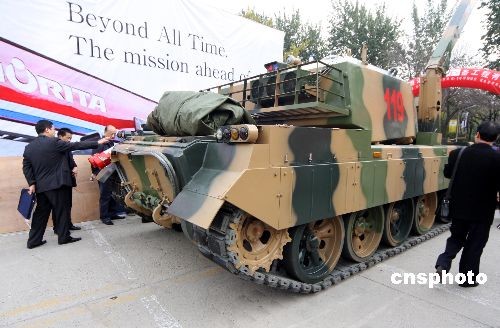 10月28日,一輛軍綠色、價值300多萬元的“消防坦克”亮相2008北京國際消防設(shè)備技術(shù)交流展。據(jù)悉,消防坦克是由中國軍用坦克改裝而成的。它采用特種裝甲鋼板制成,自重大約35噸,裝配有直流有線電控自動炮、高壓水泵、可燃和有毒氣體探測儀及防火直流照明燈,馬力很大,最高時速可達70多公里。中新社發(fā) 吳芒子 攝