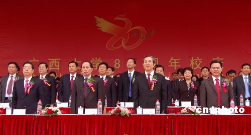 11月8日,中國廣西壯族自治區(qū)歷史最悠久、規(guī)模最大的高等學(xué)府——廣西大學(xué)舉行建校80周年慶典大會,該校校友、全國政協(xié)副主席李兆焯出席并題詞,中共廣西壯族自治區(qū)委員會書記郭聲琨、廣西壯族自治區(qū)主席馬飚等官員、廣西大學(xué)海內(nèi)外校友、學(xué)生兩萬多人出席慶典。廣西大學(xué)首任校長是和蔡元培齊名的著名科學(xué)家、教育家馬君武,當(dāng)時有“北蔡南馬”之稱。廣西大學(xué)成立80年來,已培養(yǎng)近20萬名人才,該校是21世紀中國重點建設(shè)的百所高校之一。中新社發(fā) 劉萬強 攝