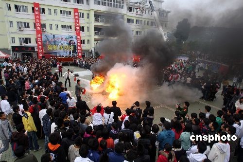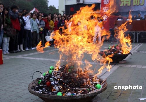 為汲取上海商學(xué)院“11.14”重大火災(zāi)事故教訓(xùn),11月22日上午,湖北三峽大學(xué)舉行了消防安全宣傳活動。組織學(xué)校師生開展了滅火逃生疏散演練,現(xiàn)場還對收繳的1000余支“熱得快”進行銷毀,提高師生的消防安全意識。中新社發(fā) 方佩 攝