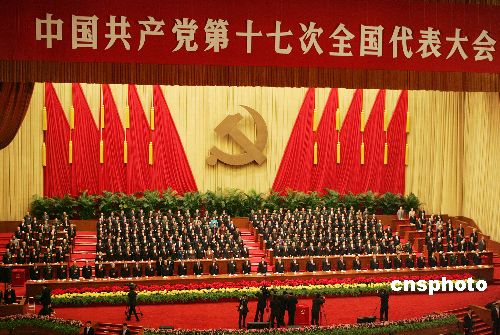 10月21日中午,中共十七大在北京人民大會(huì)堂完成各項(xiàng)議程,在軍樂(lè)團(tuán)演奏的《國(guó)際歌》樂(lè)曲中閉幕。中新社發(fā) 任晨鳴 攝