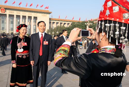 中國(guó)共產(chǎn)黨第十七次全國(guó)代表大會(huì)10月21日上午在北京人民大會(huì)堂閉幕。圖為福建代表團(tuán)的畬族代表雷金花在大會(huì)堂外為代表們拍攝紀(jì)念照。中新社發(fā) 任晨鳴 攝