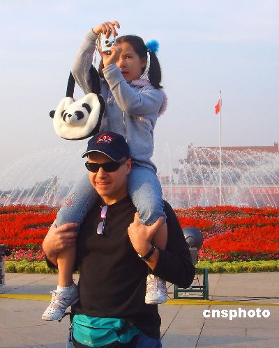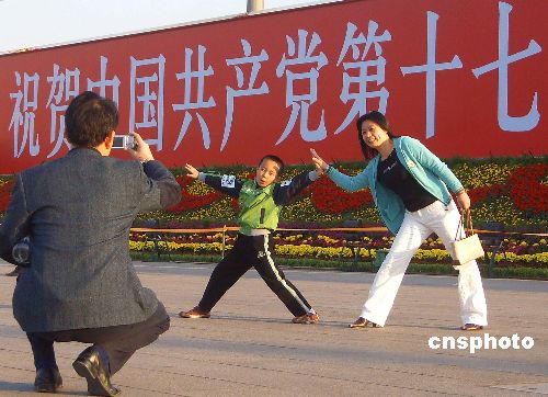 圖:“十七大”勝利閉幕 天安門廣場游客快樂留影(2)