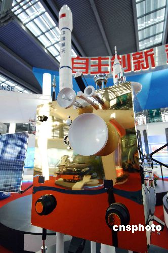 第九屆中國國際高新技術(shù)成果交易會十月十一日晚開幕,嫦娥一號月球探測衛(wèi)星亮相深圳第九屆高交會。中新社發(fā) 陳文 攝