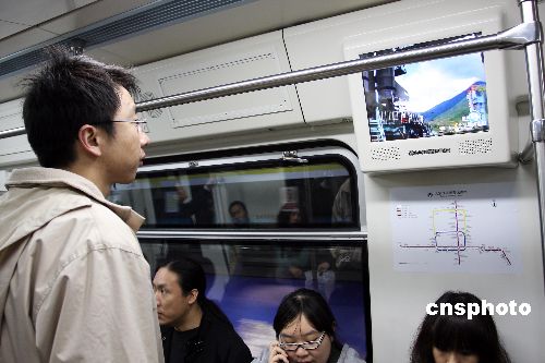 10月24日,北京市民在地鐵里通過移動電視觀看“嫦娥一號”奔月實況。北京時間十八時零五分,中國在西昌衛(wèi)星發(fā)射中心用“長征三號甲”運載火箭將“嫦娥一號”衛(wèi)星成功送入太空。據(jù)悉,這次新聞頻道將連續(xù)三天推出“嫦娥一號”特別節(jié)目,市民還可以通過中央國際網(wǎng)站和CCTV無線互聯(lián)網(wǎng)觀看奔月盛況。中新社發(fā) 鄭雄增 攝