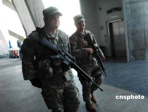 全副武裝的士兵在聖地牙哥高通體育館臨時(shí)避難場(chǎng)巡邏。