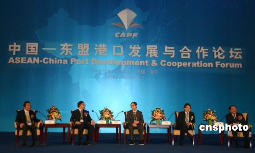 十月二十九日,新加坡萬邦集團(tuán)董事長曹慰德、印尼BLT船務(wù)公司主席王景祺、泰國宏海箱運(yùn)有限公司高級副總裁彭猜、深圳鹽田港董事長鄭京生以及中國海運(yùn)集團(tuán)公司副總裁張國華列席在廣西南寧舉行的“中國—東盟港口發(fā)展與合作論壇”,暢談港口合作。中新社發(fā) 王剛 攝