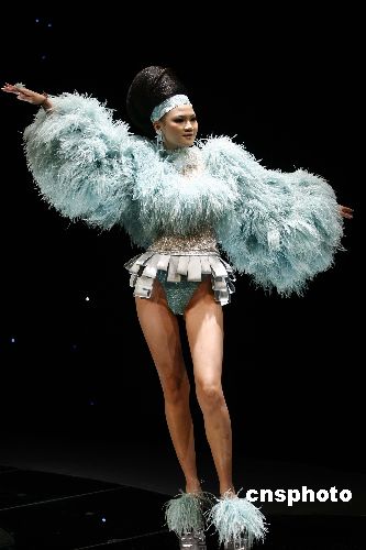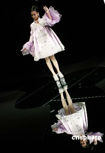 十一月三日晚,在北京舉行的2007年中國國際時裝周的舞臺上,模特在夢幻般的舞臺上展示設計師華麗的作品。中新社發(fā) 盛佳鵬 攝