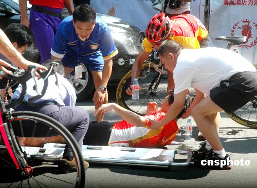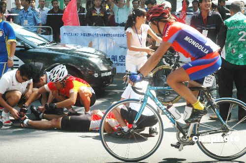 2007年11月6日,“海馬汽車杯”環(huán)海南島國際公路自行車賽進(jìn)入第三賽段文昌——?诒荣。各國選手在歷經(jīng)總里程125公里后,快速?zèng)_刺設(shè)在?谑袨I海大道的終點(diǎn)站時(shí),一名在劃線內(nèi)的記者突然探頭出來搶拍照片,結(jié)果被撞頭破血流,相機(jī)摔破,而兩名選手人仰馬翻摔成重傷,另一選手被擦輕傷,當(dāng)時(shí)的驚險(xiǎn)場面引起觀賽者一片驚呼聲。中新社發(fā) 善平 攝